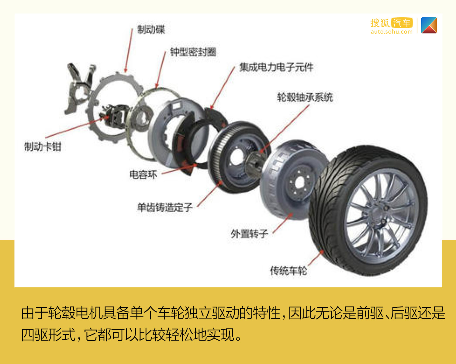 剛才也提到,雙電機(jī)形成的四驅(qū)或許不是未來(lái)真正的樣子,現(xiàn)在只是過(guò)渡階段,理論上來(lái)說(shuō),一輪一個(gè)動(dòng)力源是四驅(qū)技術(shù)的終極狀態(tài),也就是我們常說(shuō)的輪轂電機(jī)。其最大的特點(diǎn)就是將驅(qū)動(dòng)、傳動(dòng)和制動(dòng)裝置都整合到輪轂內(nèi),省略了離合器、變速器、傳動(dòng)軸、差速器、分動(dòng)器等傳動(dòng)部件,由于輪轂電機(jī)具備單個(gè)車(chē)輪獨(dú)立驅(qū)動(dòng)的特性,因此無(wú)論是前驅(qū)、后驅(qū)還是四驅(qū)形式,它都可以比較輕松地實(shí)現(xiàn)。每輪一個(gè)動(dòng)力源也能夠讓車(chē)輛反映更快、效率更高,且不占用更多的空間。